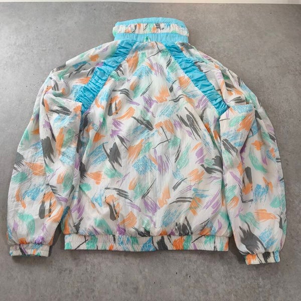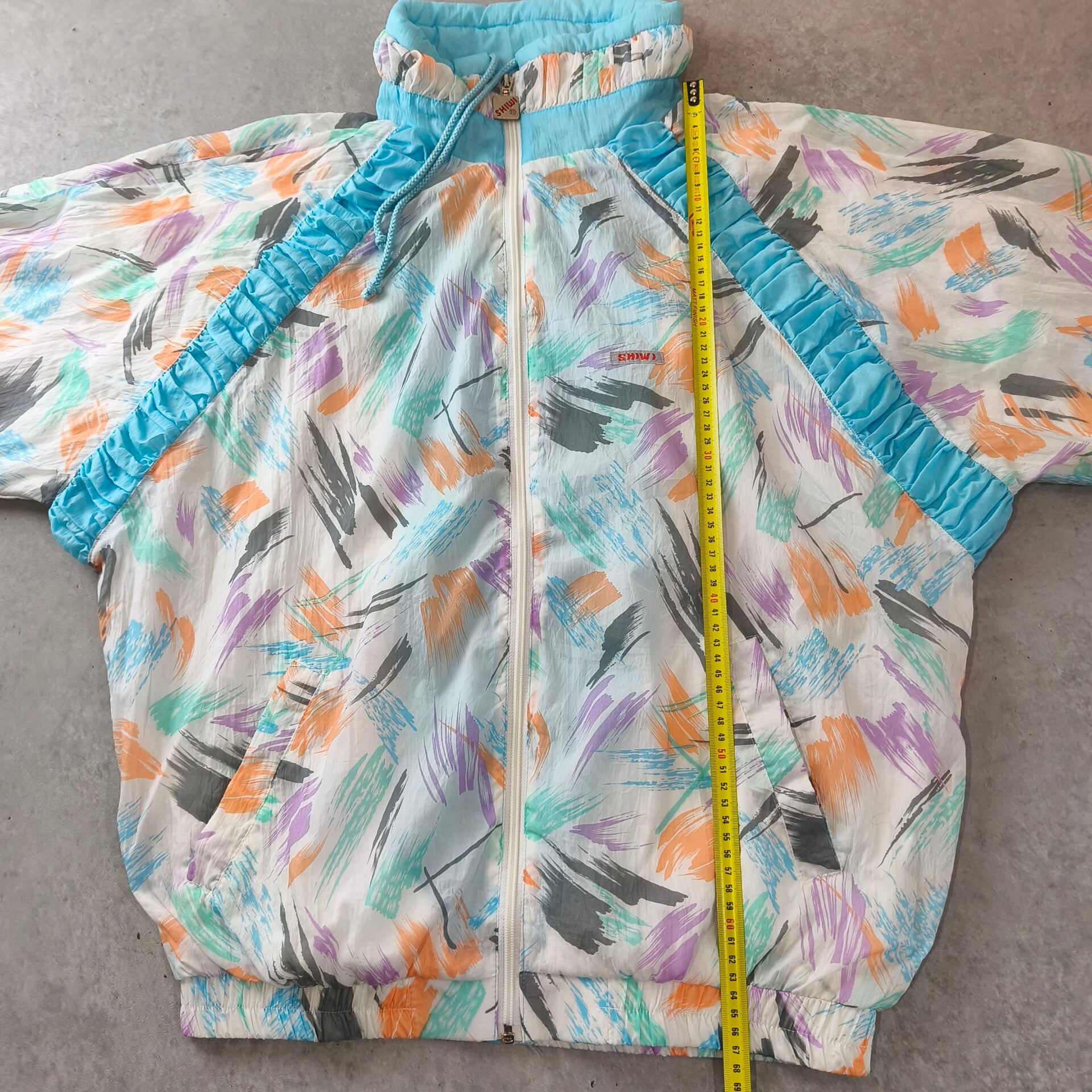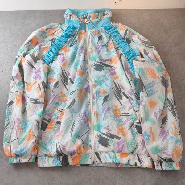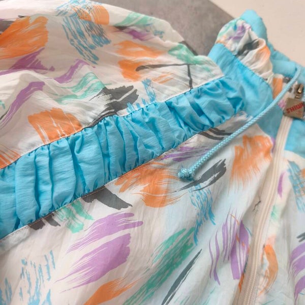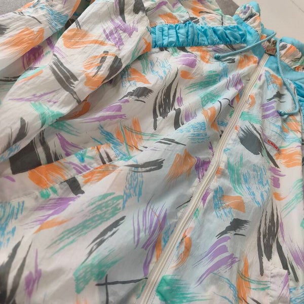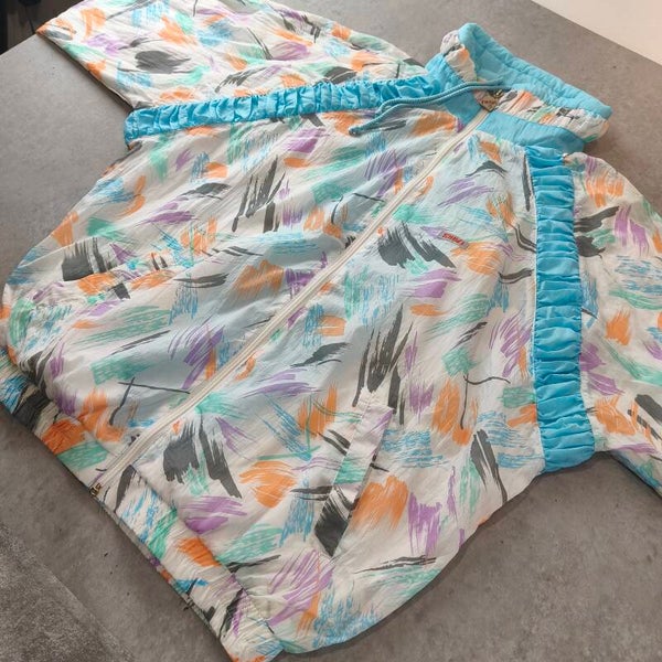 Ensemble de survêtement vintage complet (veste + pantalon) de la marque Shiwi Sports Wear. Un look authentique des années 80/90 avec un motif "coups de pinceau" coloré et des détails plissés originaux sur les épaules.