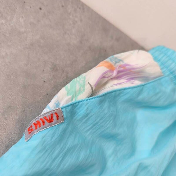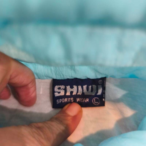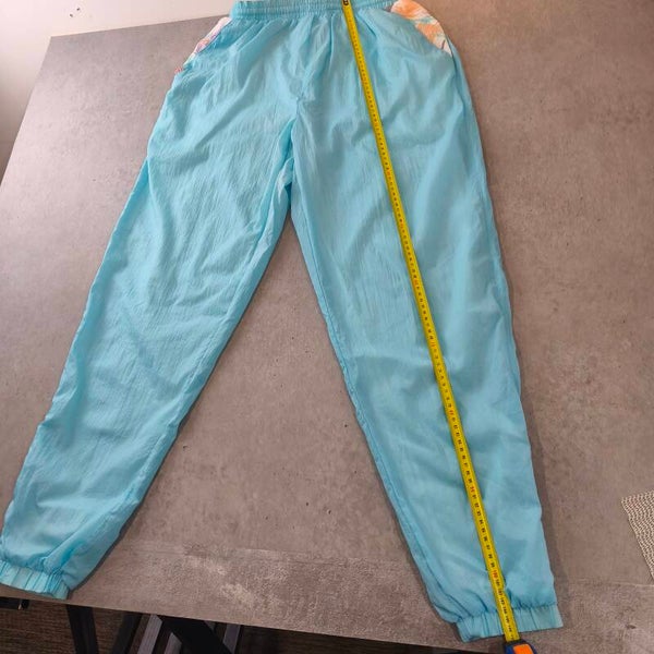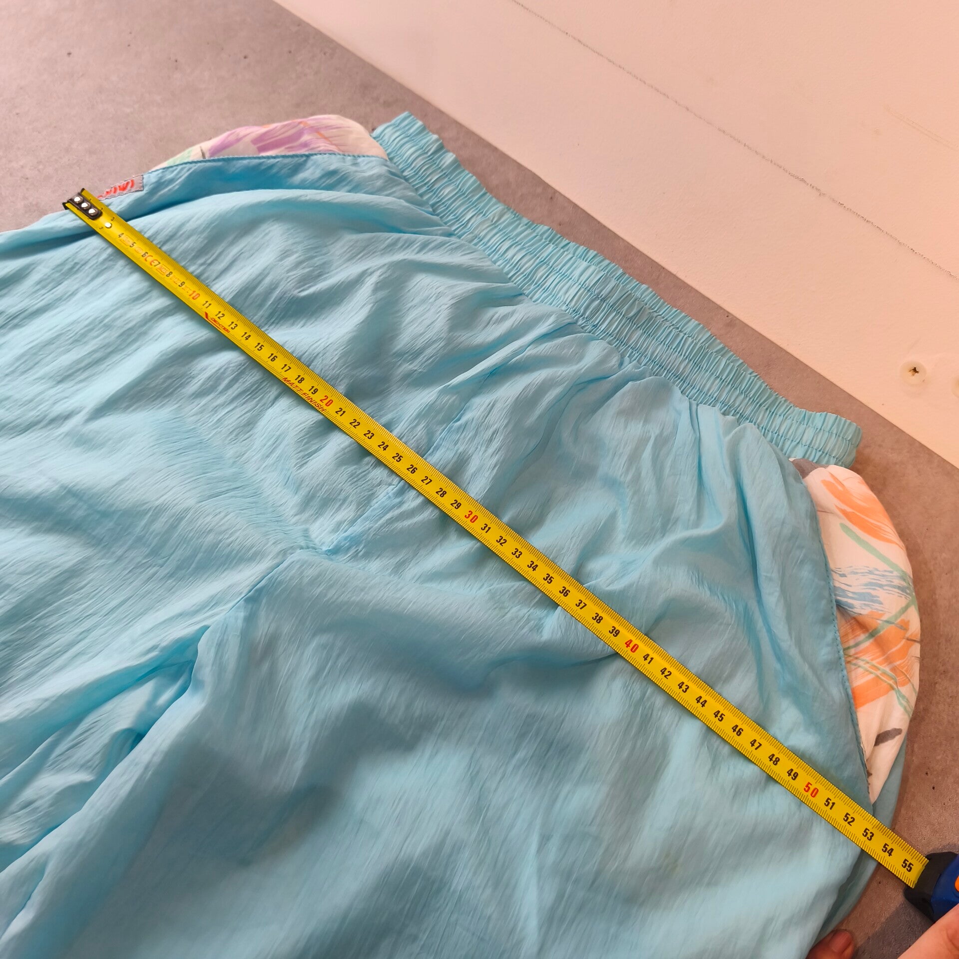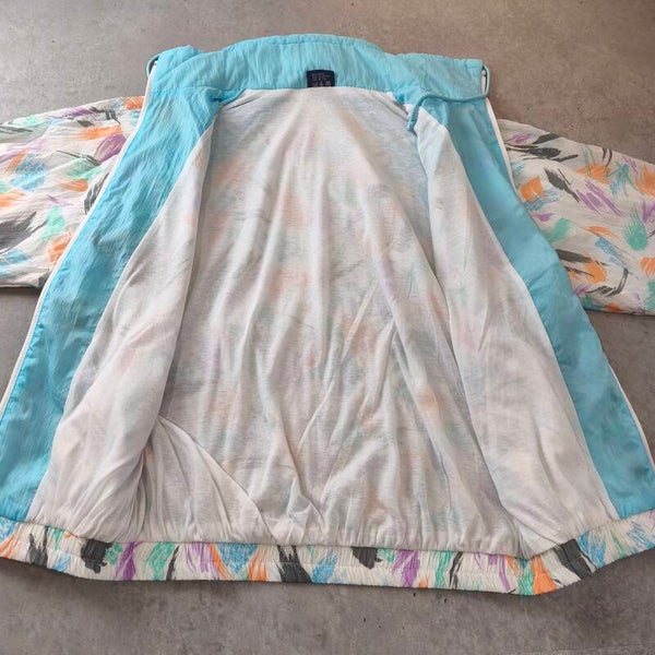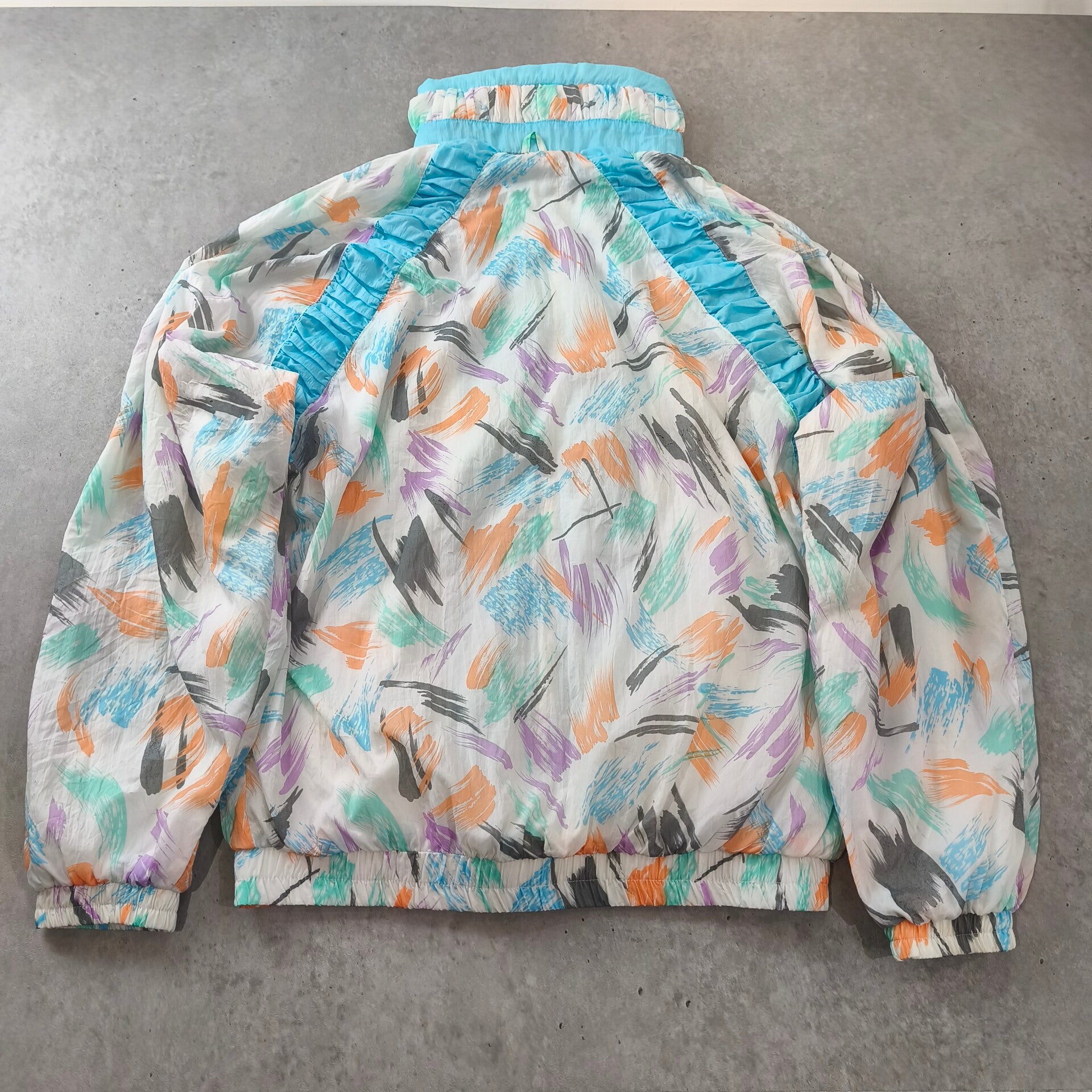 Ensemble de survêtement vintage complet (veste + pantalon) de la marque Shiwi Sports Wear. Un look authentique des années 80/90 avec un motif "coups de pinceau" coloré et des détails plissés originaux sur les épaules.