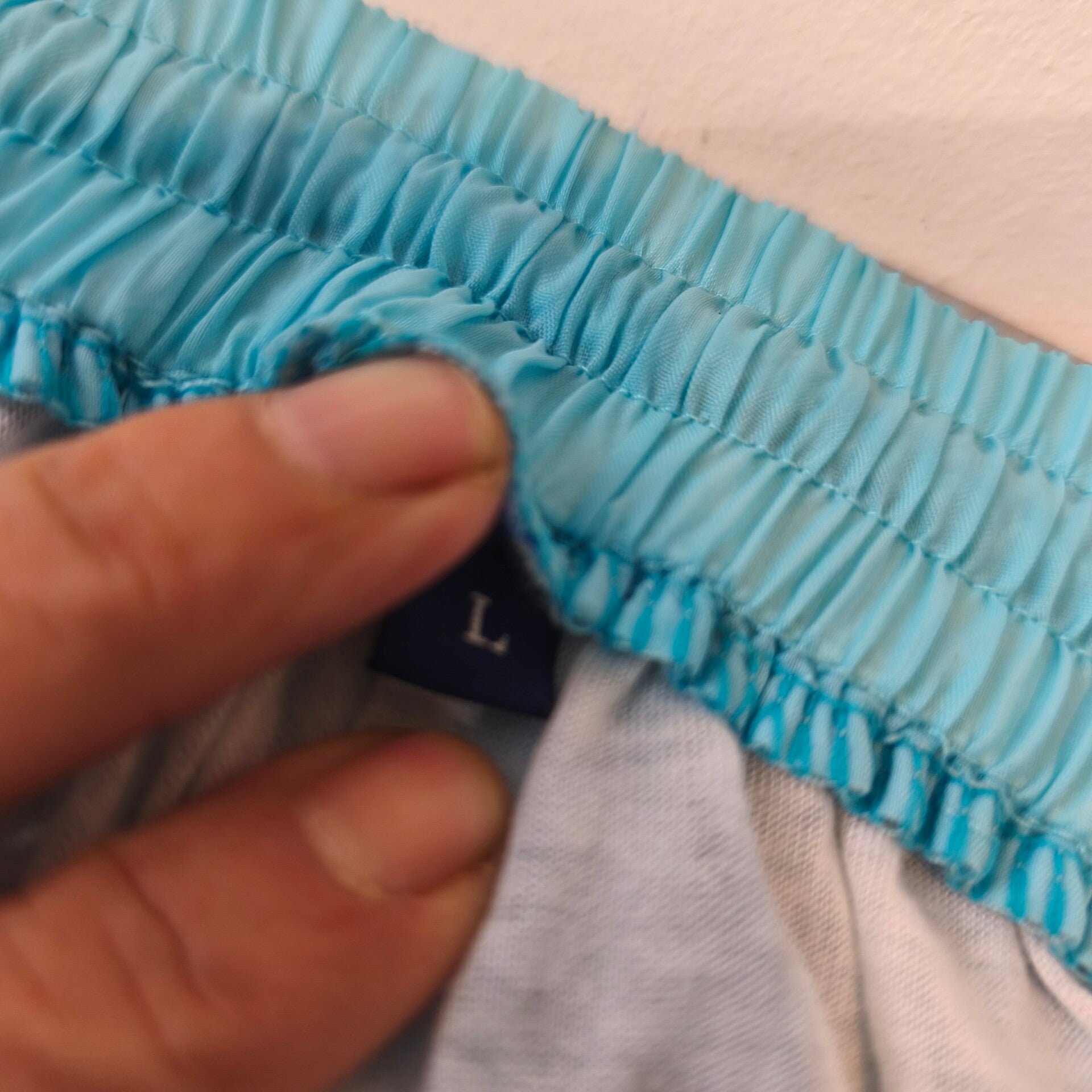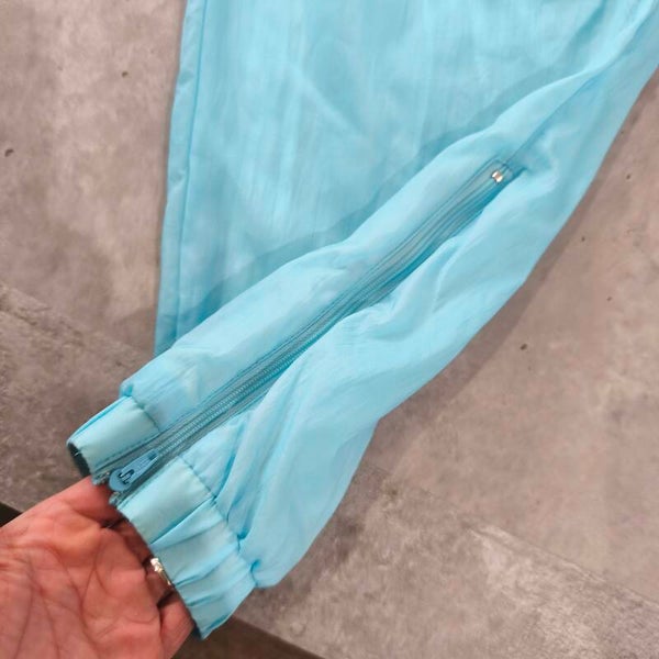 Pantalon : Couleur bleu ciel assortie, taille élastiquée avec cordon, poches avec rappel du motif de la veste. Bas de jambes élastiqués et fermeture