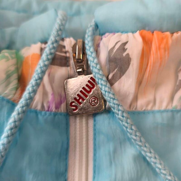 Veste : Coupe coupe-vent avec fermeture éclair, col montant, cordons de serrage et deux poches latérales. Détails plissés bleu ciel sur le buste.
