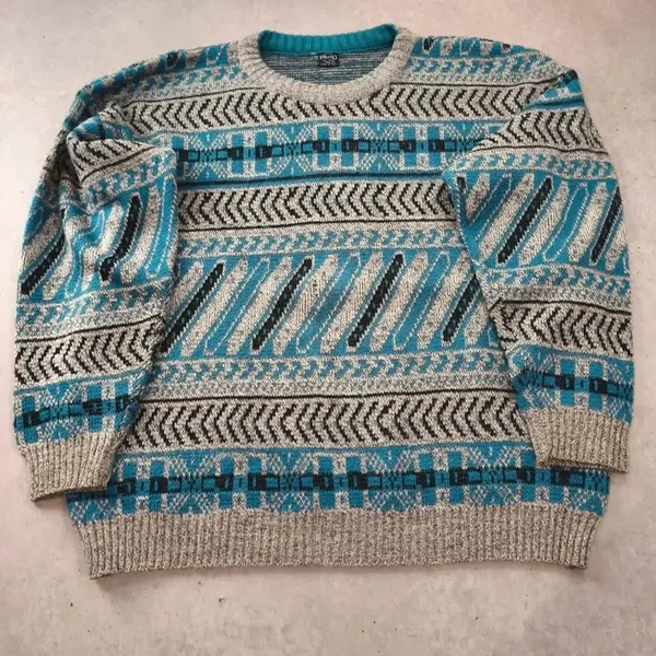 Style: Pull Ras-du-cou, motif géométrique/jacquard, style Rétro/Vintage (années 80/90)