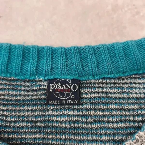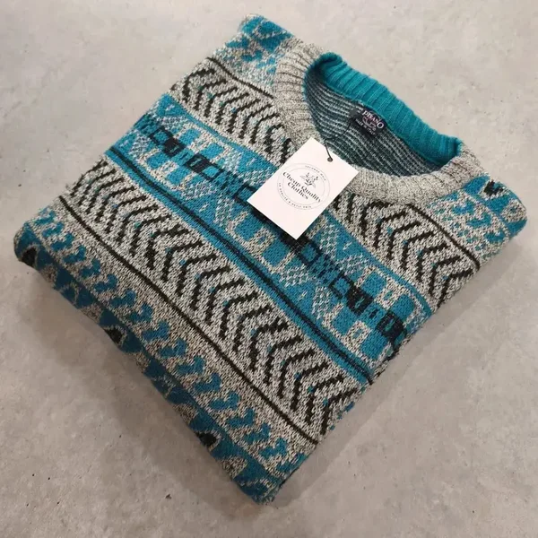 Un pull vintage PISANO TREND Made in Italy avec un motif jacquard géométrique accrocheur dans des tons de bleu , gris chiné, et noir. Parfait pour un look rétro et confortable.
