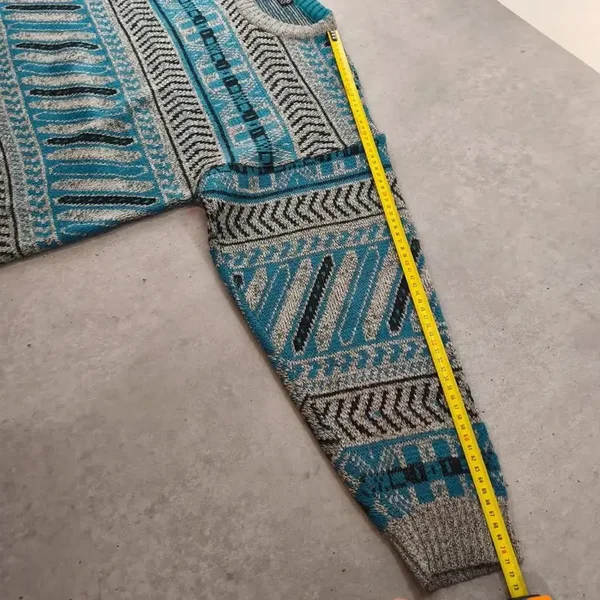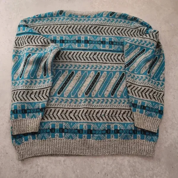 Pull Rétro / Vintage 40% laine – Motif Géométrique Bleu/Gris/Noir L/XL