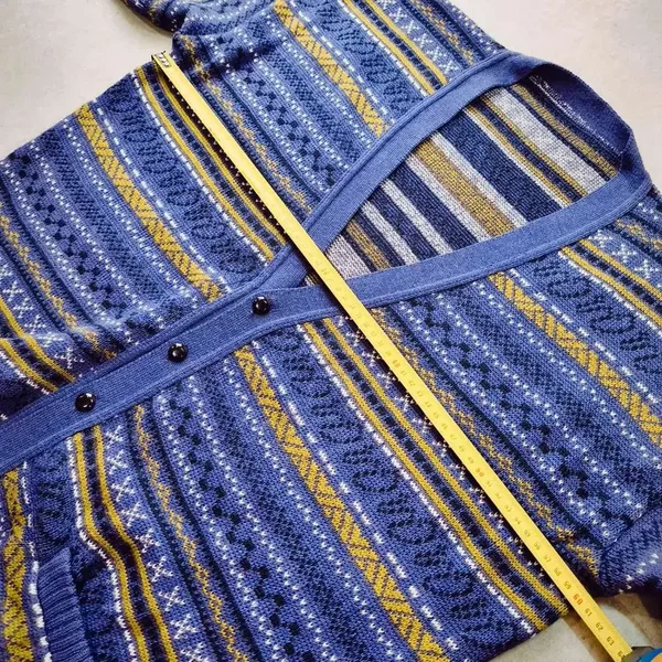 Bien que l'étiquette de taille soit absente, les mesures correspondent à un XL Le cardigan est en bon état