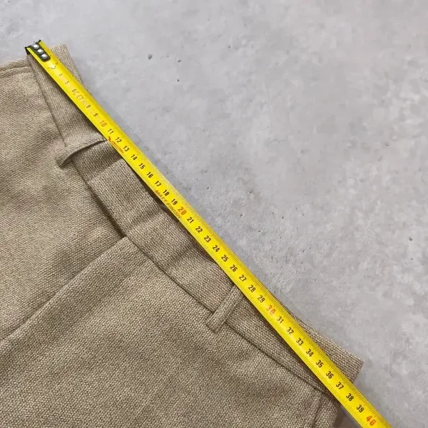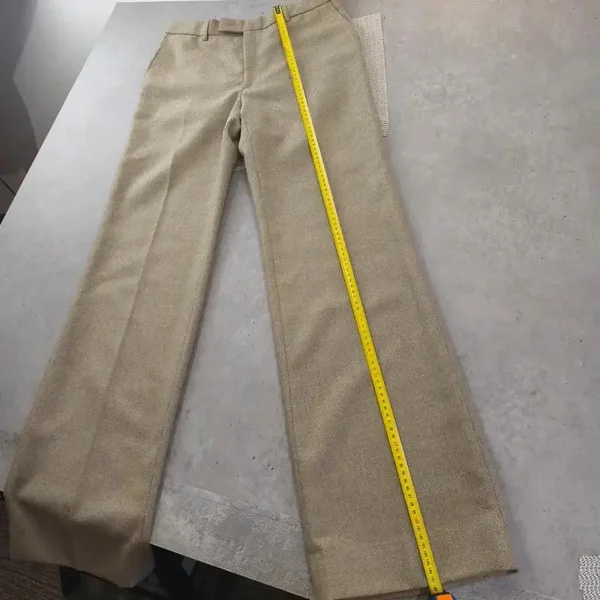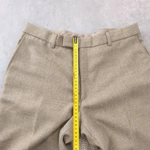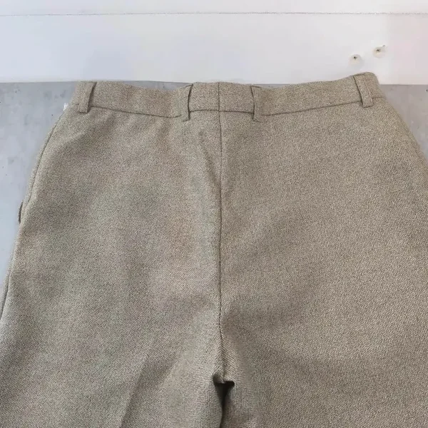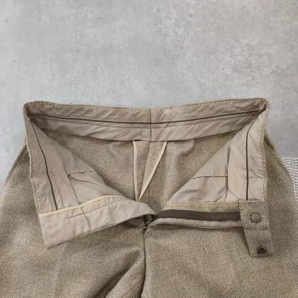 Ce modèle présente une superbe texture chinée dans les tons beige/sable, typique des pièces rétro de qualité. Il possède une coupe droite élégante avec un tombé impeccable grâce à son mélange de matières.