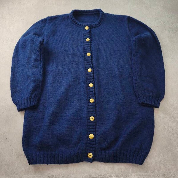 Gilet bleu marine à la coupe longue et vintage est la pièce parfaite pour un look cosy et élégant. Sans étiquette de composition. (Probablement un mélange laine/acrylique)