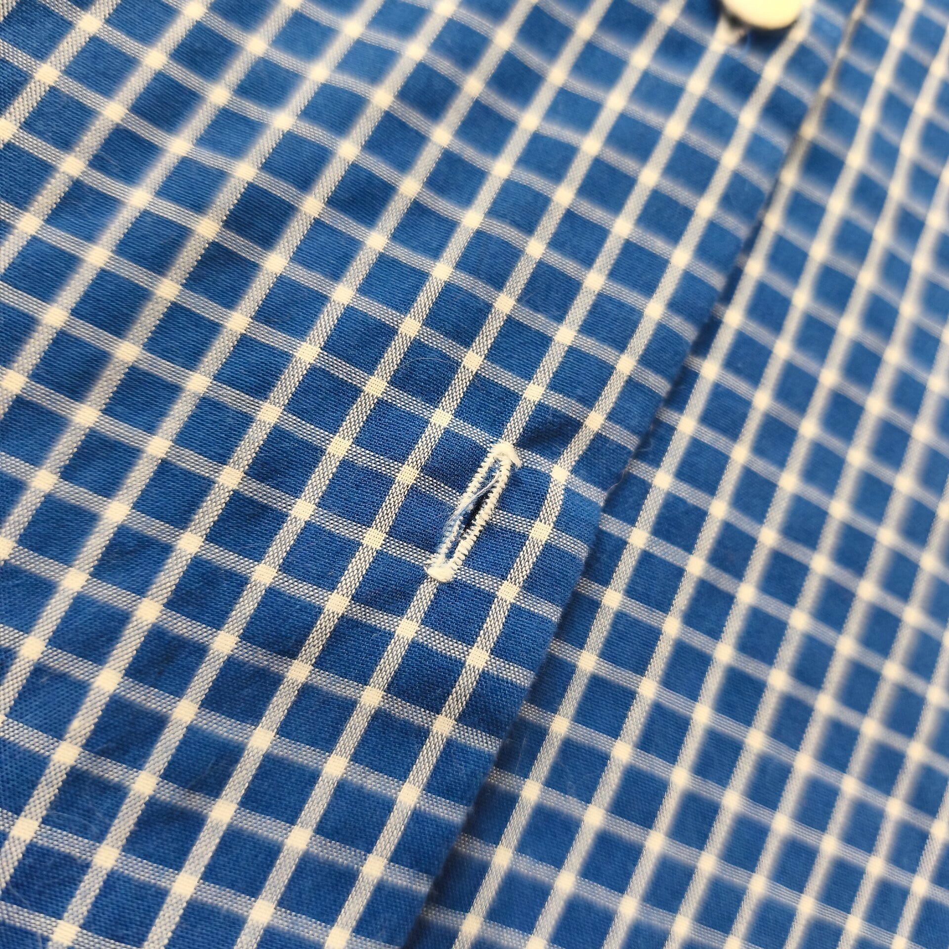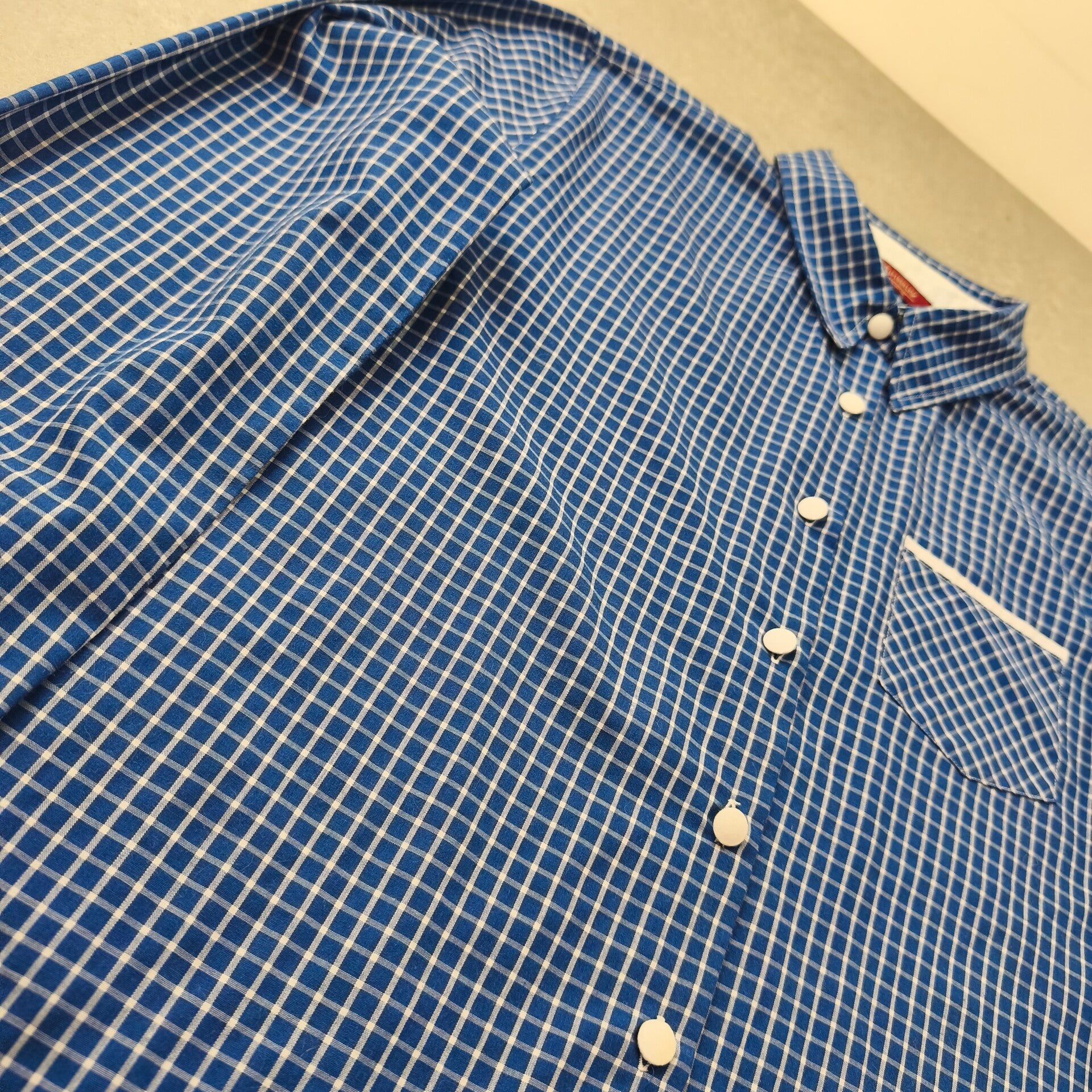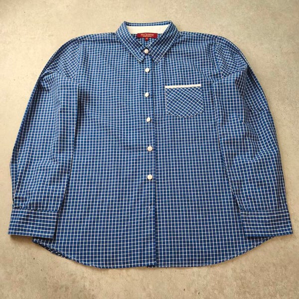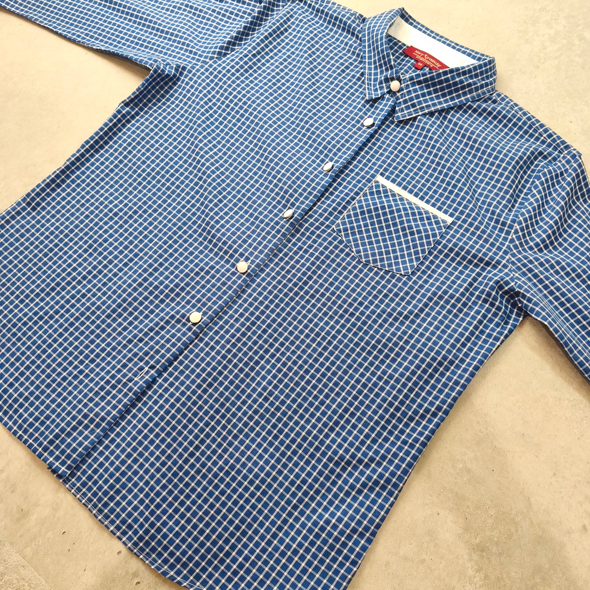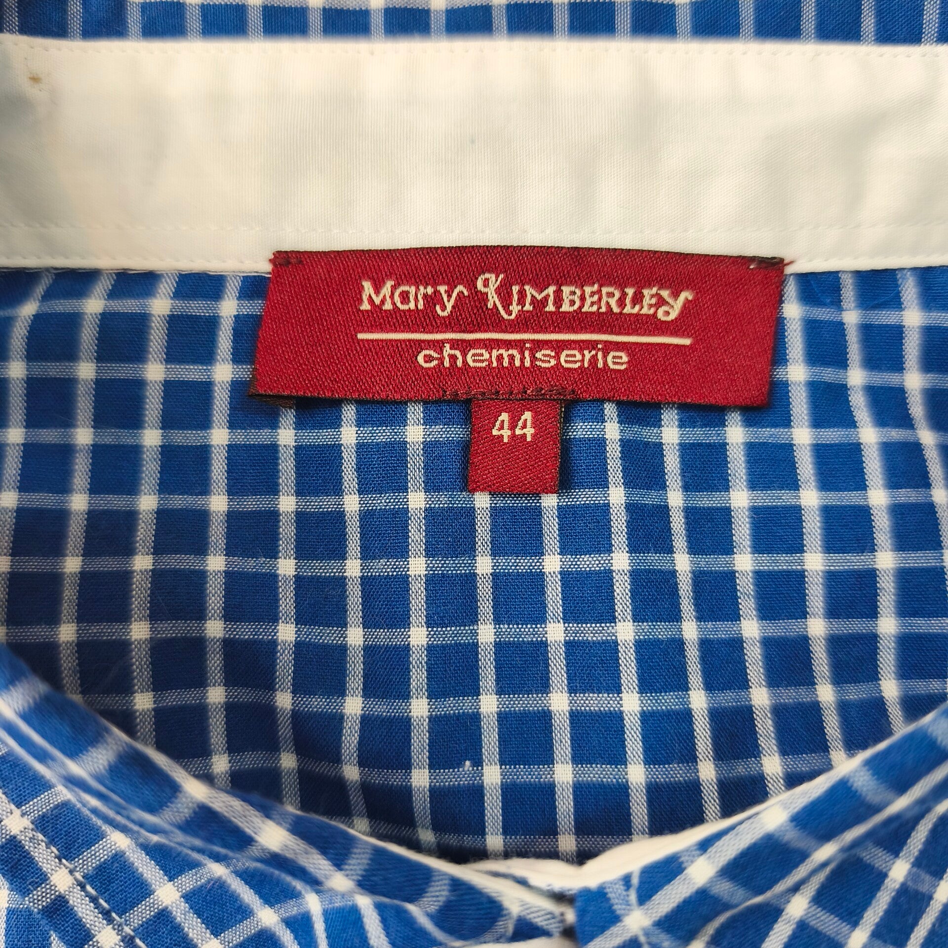 Sublime chemisier vintage de la marque Mary Kimberley (ligne Chemiserie). Un classique intemporel avec son motif à petits carreaux bleus et blancs, parfait pour un look rétro-chic