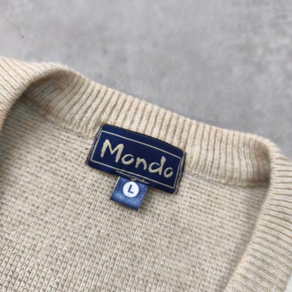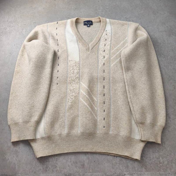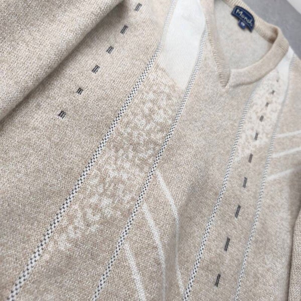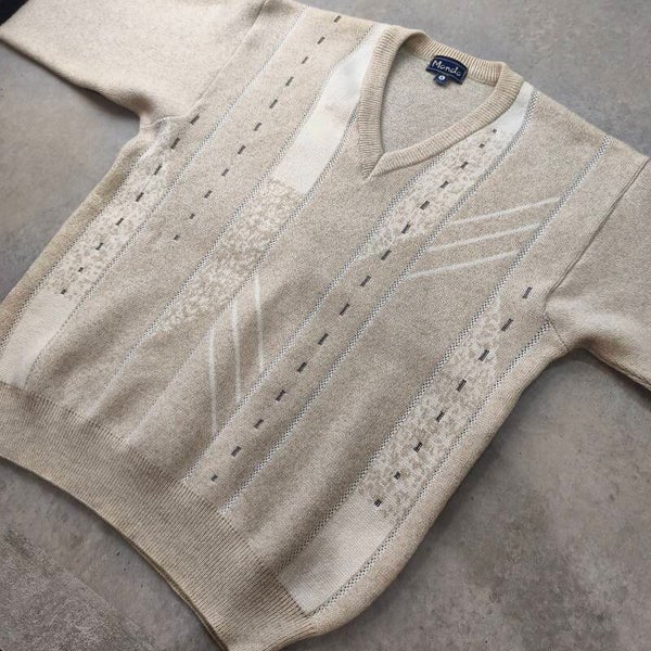Superbe pull vintage de la marque Mondo, au style rétro élégant et minimaliste. Sa couleur beige crème chinée et ses motifs géométriques verticaux lui donnent un look texturé unique, parfait pour un style "Old Money" ou vintage décontracté.