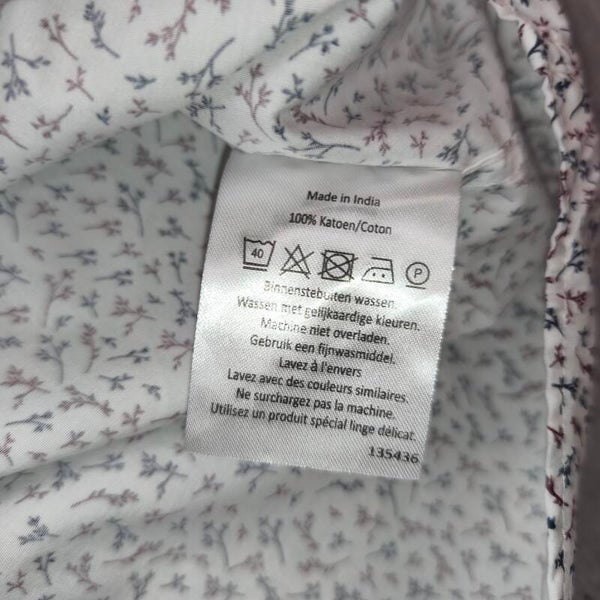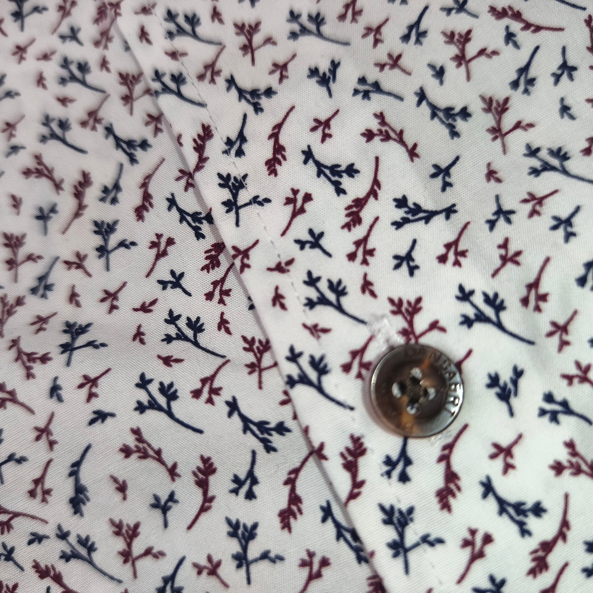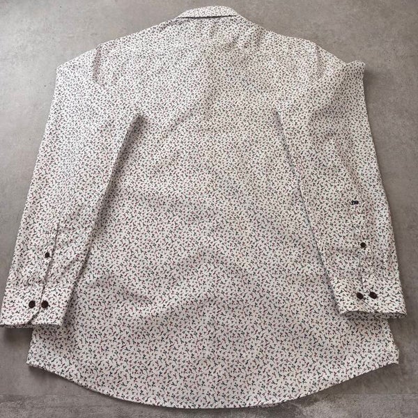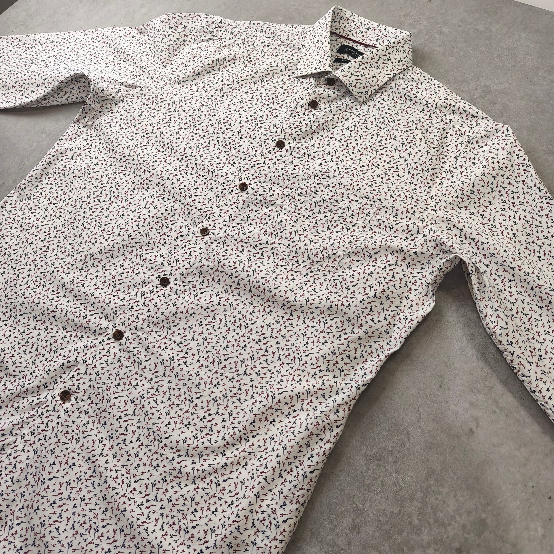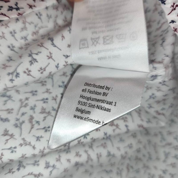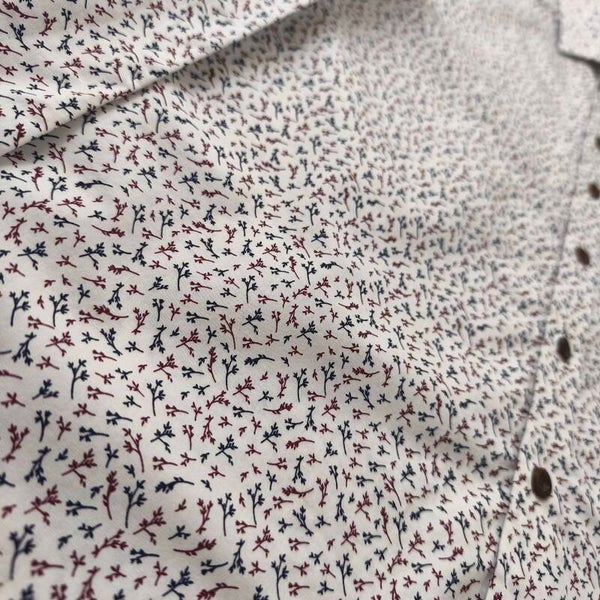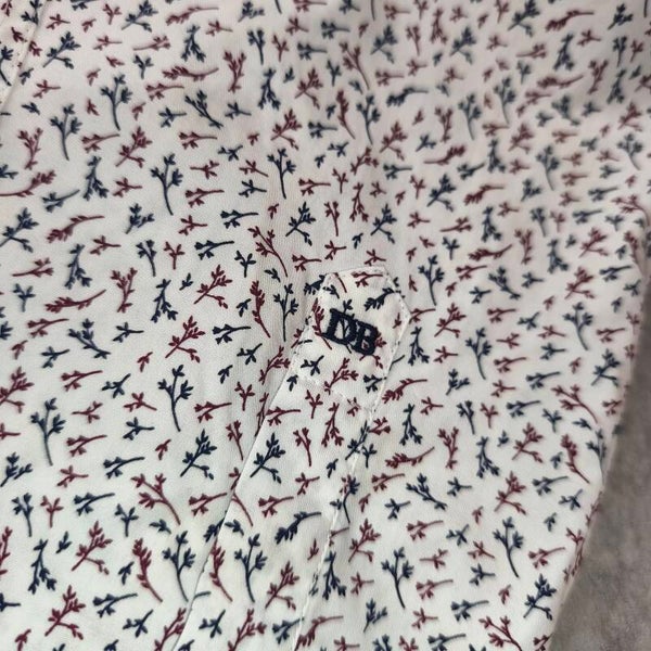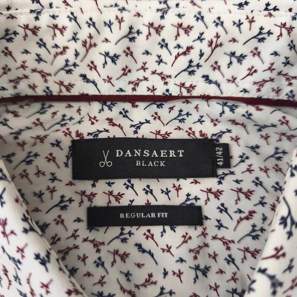 Magnifique chemise de la marque Dansaert Black (distribuée par e5 Fashion). Elle arbore un motif dans les tons bleu marine et bordeaux sur fond blanc, ce qui lui donne un look à la fois élégant et moderne.