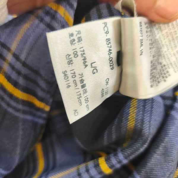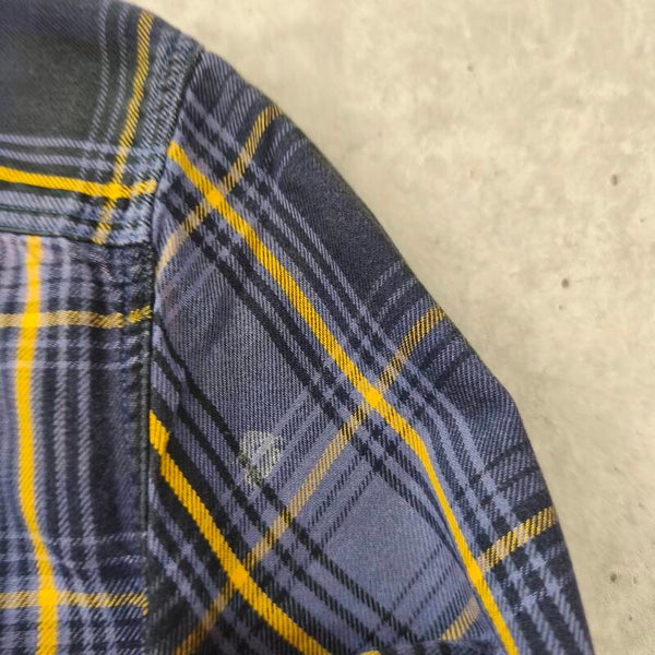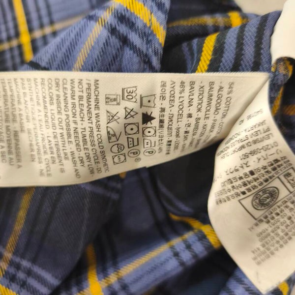 Le tissu est un mélange confortable (54% coton / 46% Lyocell), ce qui lui donne un toucher plus doux et un meilleur tombé qu'une flanelle 100% coton classique. Elle présente un motif à carreaux bleu marine, bleu violine et jaune moutarde très sympa.